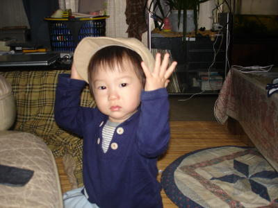 [写真:新しい帽子を嫌がるハジメ・・似合うのに...]