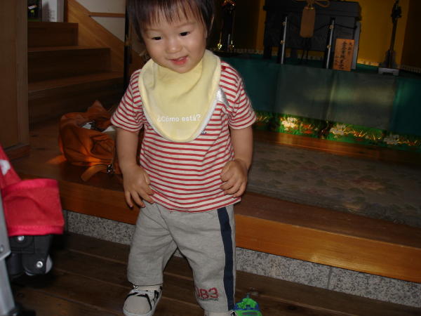 今日、おやつのときに、ミニパンを3つお皿にいれ、ストローマグに入れた麦茶とあげたのだけど、私が台所で片づけをしていたら、ハジメがにこにこしながら歩いてきて、